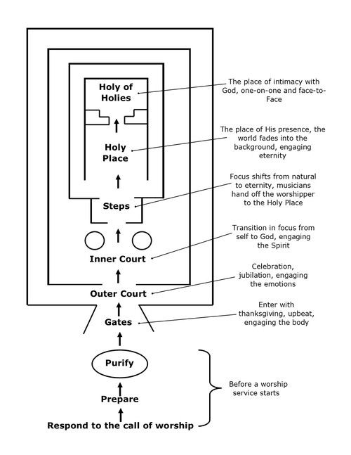The temple model is a biblical structure that leads us through the: